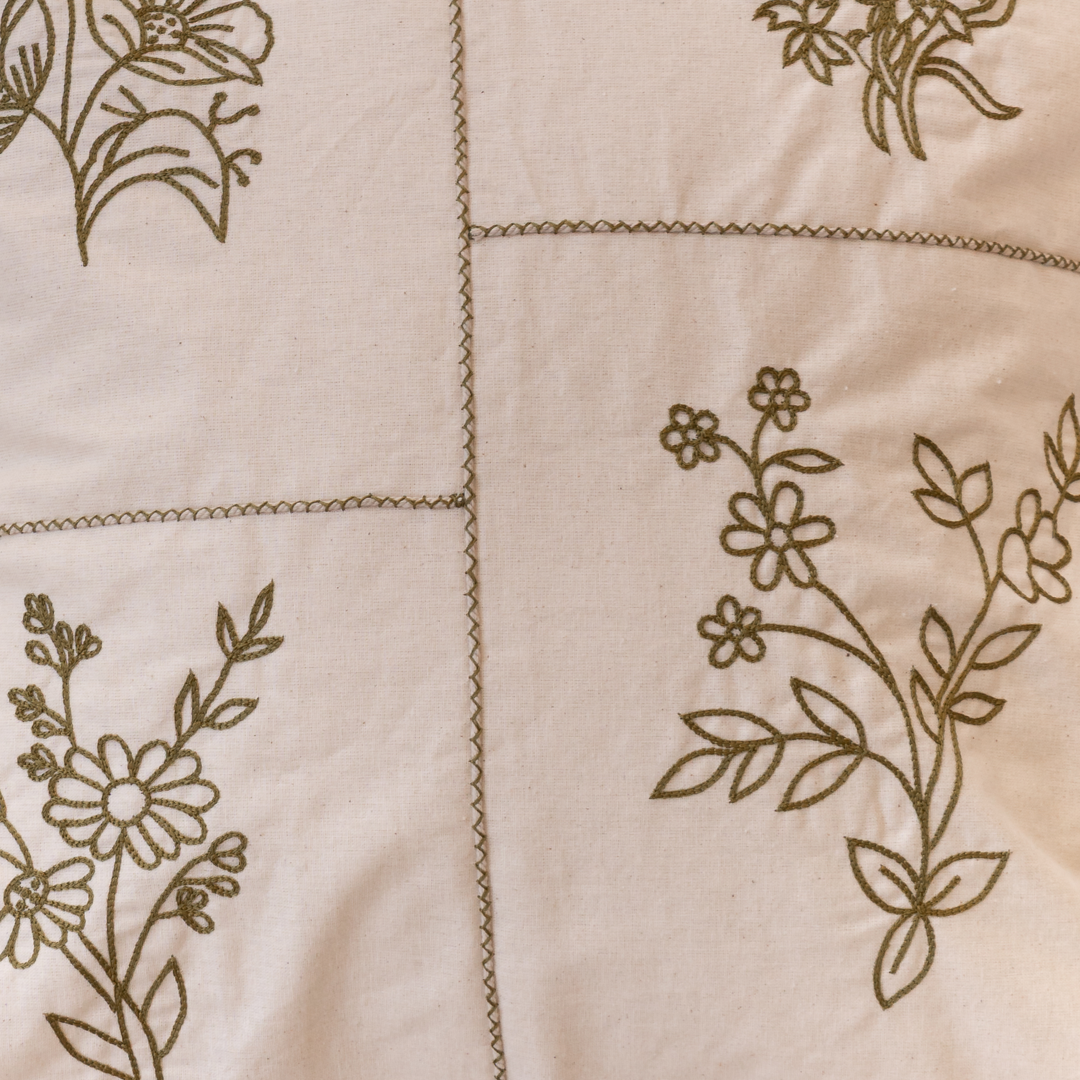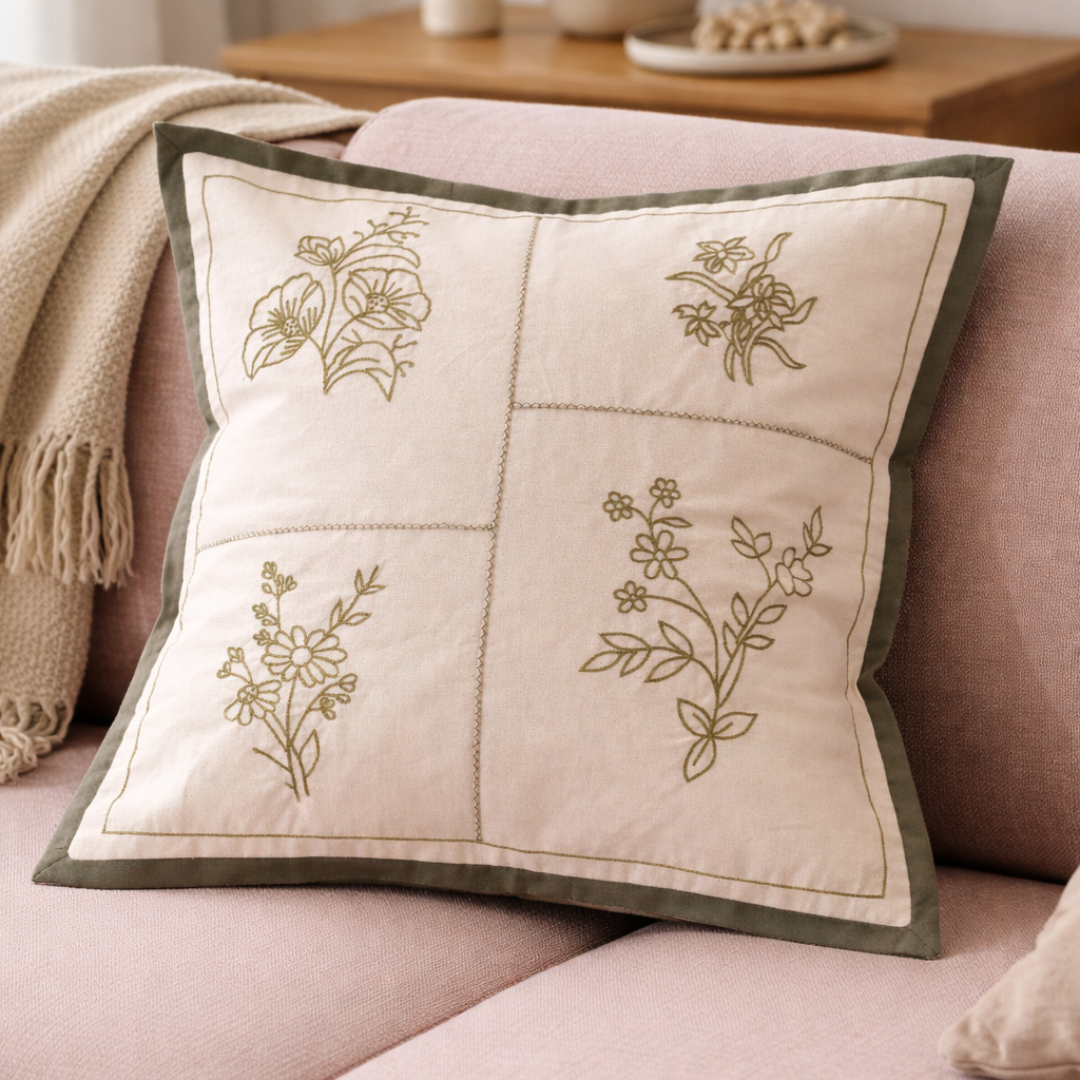 Elevate your space with the timeless elegance of our Floral Kaleidoscope Cushion Cover. Designed with a beautifully structured four-panel layout, each quadrant showcases a delicate floral motif embroidered in earthy olive tones. The subtle contrast between the soft ivory base and the deep olive border adds definition and sophistication to the design.