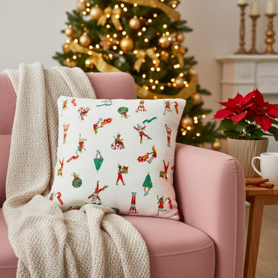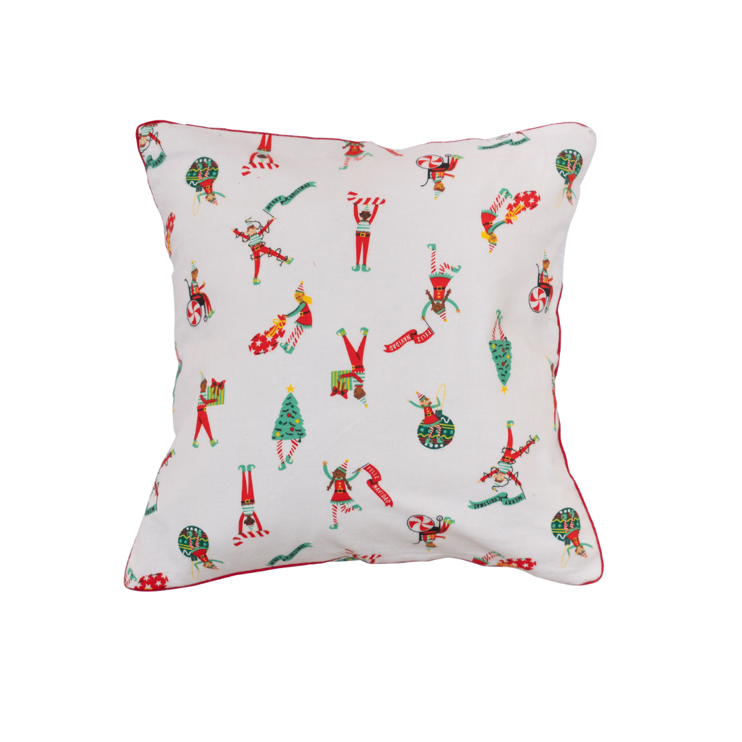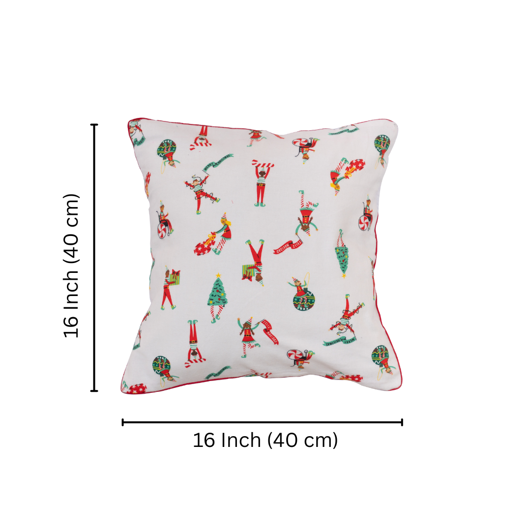 Designed with a lively, whimsical printed pattern, this cushion cover features energetic illustrations of Christmas elves performing acrobatics, juggling ornaments, and celebrating amidst candy canes and festive trees. The bright, playful print against the clean white background, framed by a striking red piped trim, instantly adds a dash of fun and cozy comfort to any space—making it perfect for holiday setups, a child's room, or bringing a joyous, carnival atmosphere to your everyday styling.