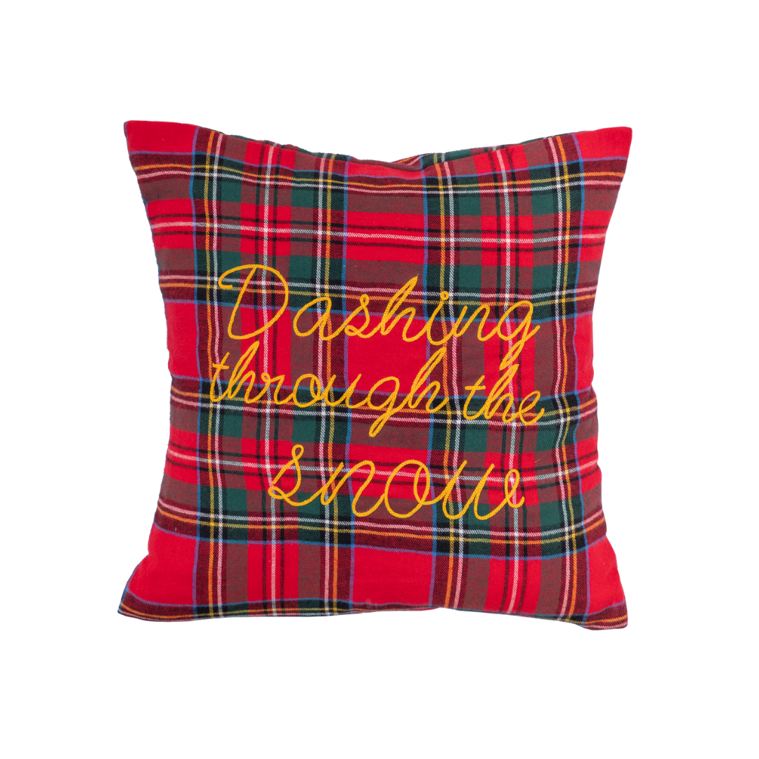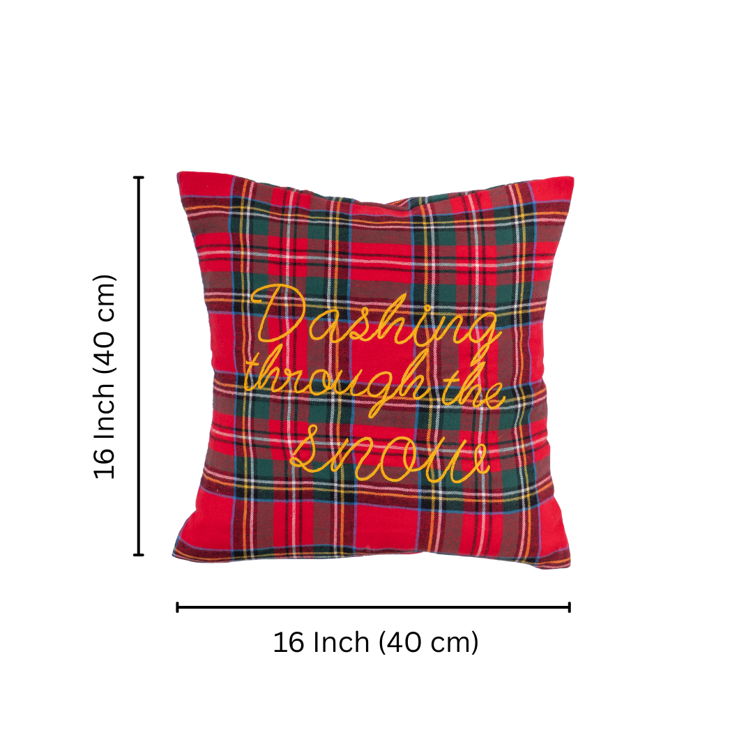 Designed with a classic festive pattern, this cushion cover features a traditional rich red and green Christmas tartan plaid. The timeless background is elegantly overlaid with vibrant yellow embroidered script lettering that reads, "Dashing through the snow." This cushion instantly adds holiday cheer, warmth, and traditional comfort to any space—making it an essential element for classic Christmas décor, winter setups, or bringing a nostalgic feel to your everyday styling.