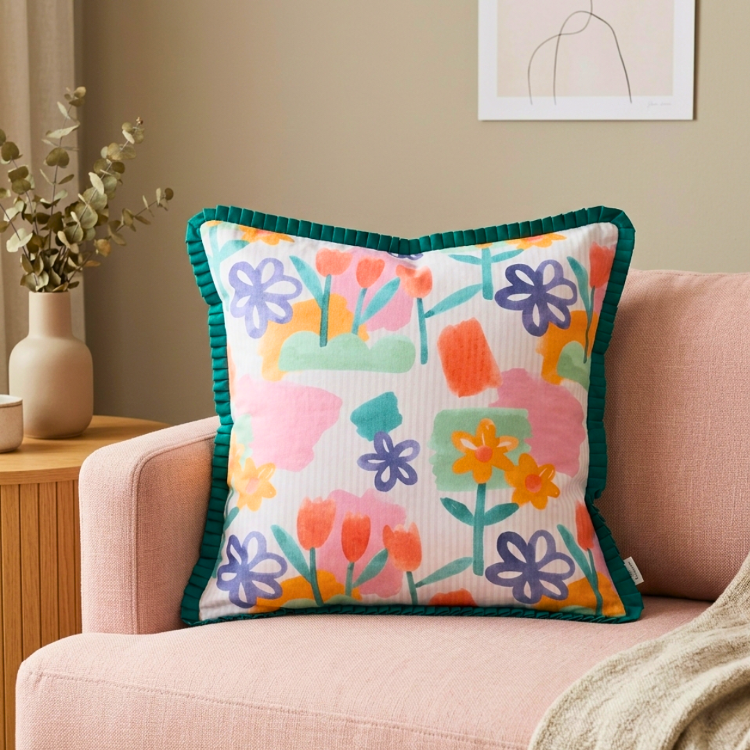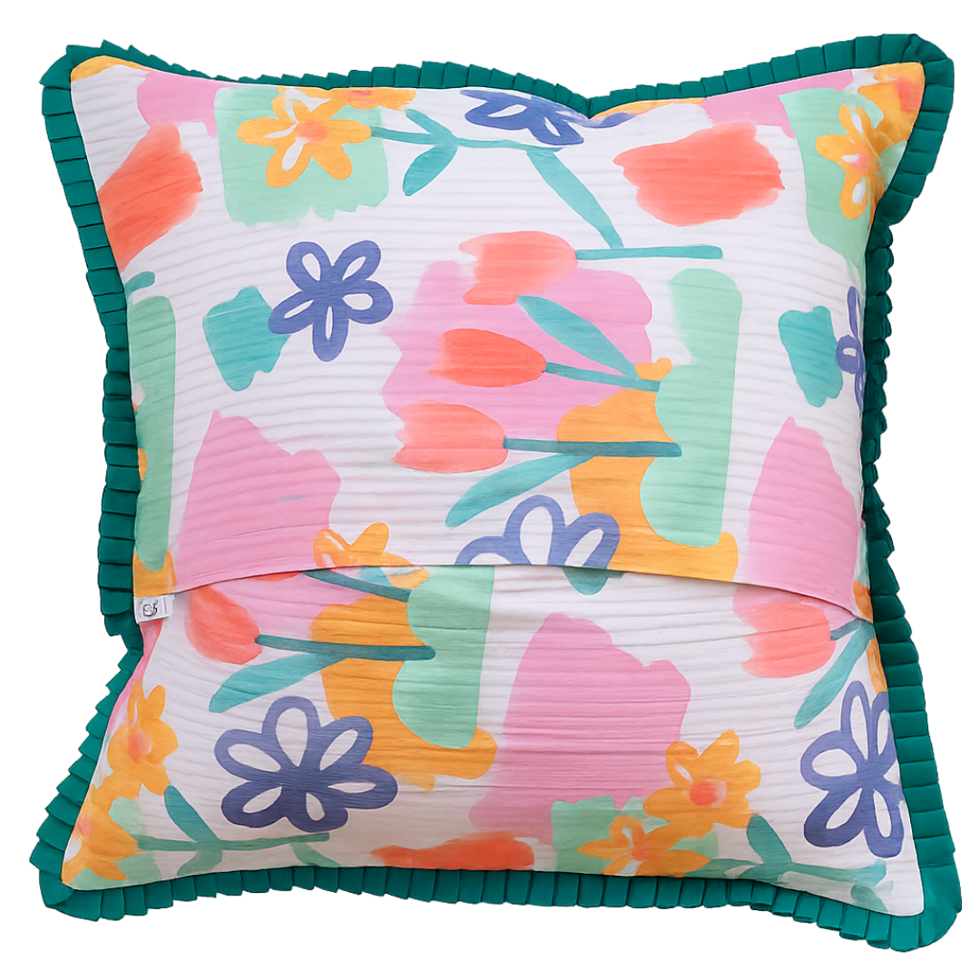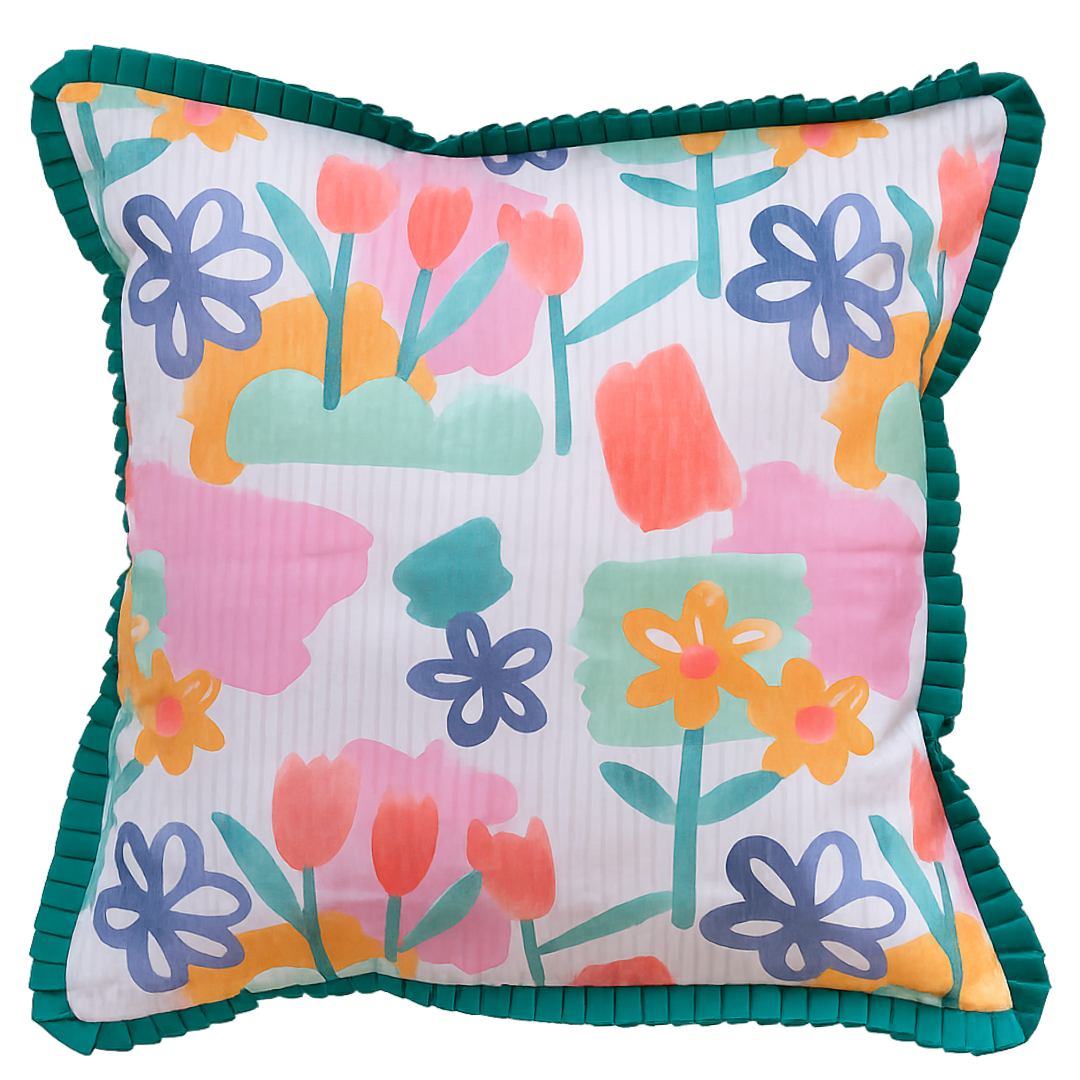 Brighten up your space with this cheerful and contemporary floral cushion cover. Featuring bold, abstract blooms in lively shades of coral, pink, yellow, teal, and blue, the design brings a playful artistic touch to any room. The soft watercolor-inspired shapes combined with subtle vertical stripe detailing create a modern, statement-making look. Finished with a contrasting emerald green pleated trim, this cushion cover adds a refined edge while keeping the overall vibe fresh and fun.