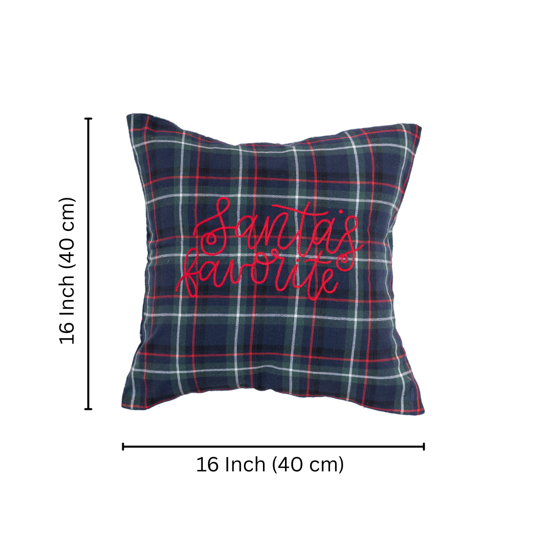 Designed with a warm, sophisticated pattern, this cushion cover features a classic navy, green, and white tartan plaid. The rich, deep background is boldly accented by vibrant red embroidered script lettering that playfully declares "Santa's favourite." This cushion instantly adds traditional charm, cozy comfort, and a cheeky spirit to any space—making it an essential piece for winter décor, holiday setups, or adding a stylish, festive flair to your everyday seating.