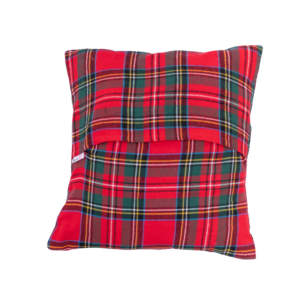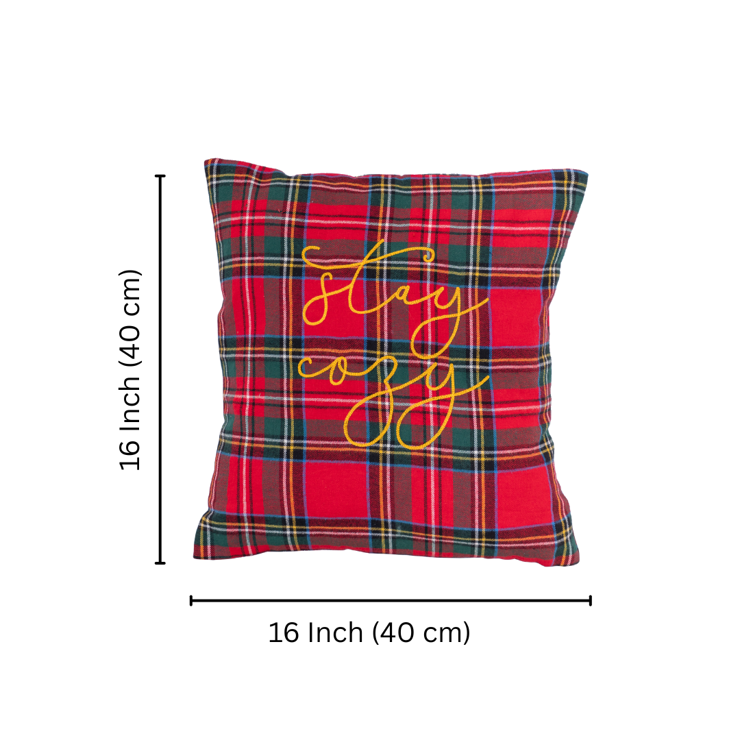 Designed with a timeless and inviting pattern, this cushion cover features a classic deep red and forest green tartan plaid. The rich, traditional background is charmingly accented by bright yellow embroidered script lettering that urges you to "stay cozy." This cushion instantly adds warmth, classic style, and comforting appeal to any space—making it a perfect piece for holiday setups, winter décor, or simply setting a relaxed, inviting mood year-round.