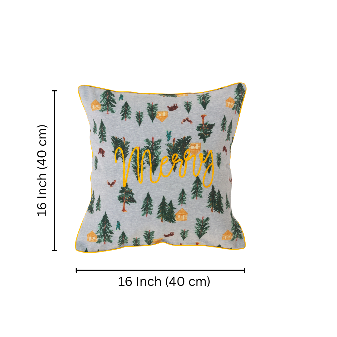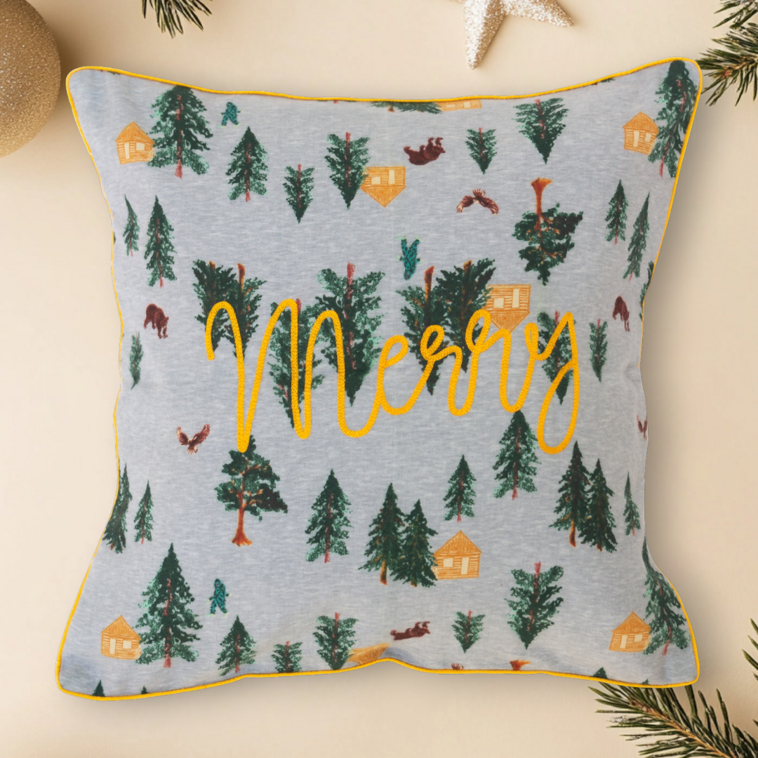 Designed with a charming, rustic printed pattern, this cushion cover features a serene forest scene of pine trees, cozy log cabins, and woodland creatures (like bears and deer) set against a soft, light grey background. The cozy print is highlighted by vibrant yellow embroidered script lettering that simply says "Merry," framed by a matching yellow piped trim. This cushion instantly adds woodland charm, festive comfort, and a relaxed, natural feel to any space—perfect for Rustic Christmas décor, lodge-style settings, or bringing the outdoors in.