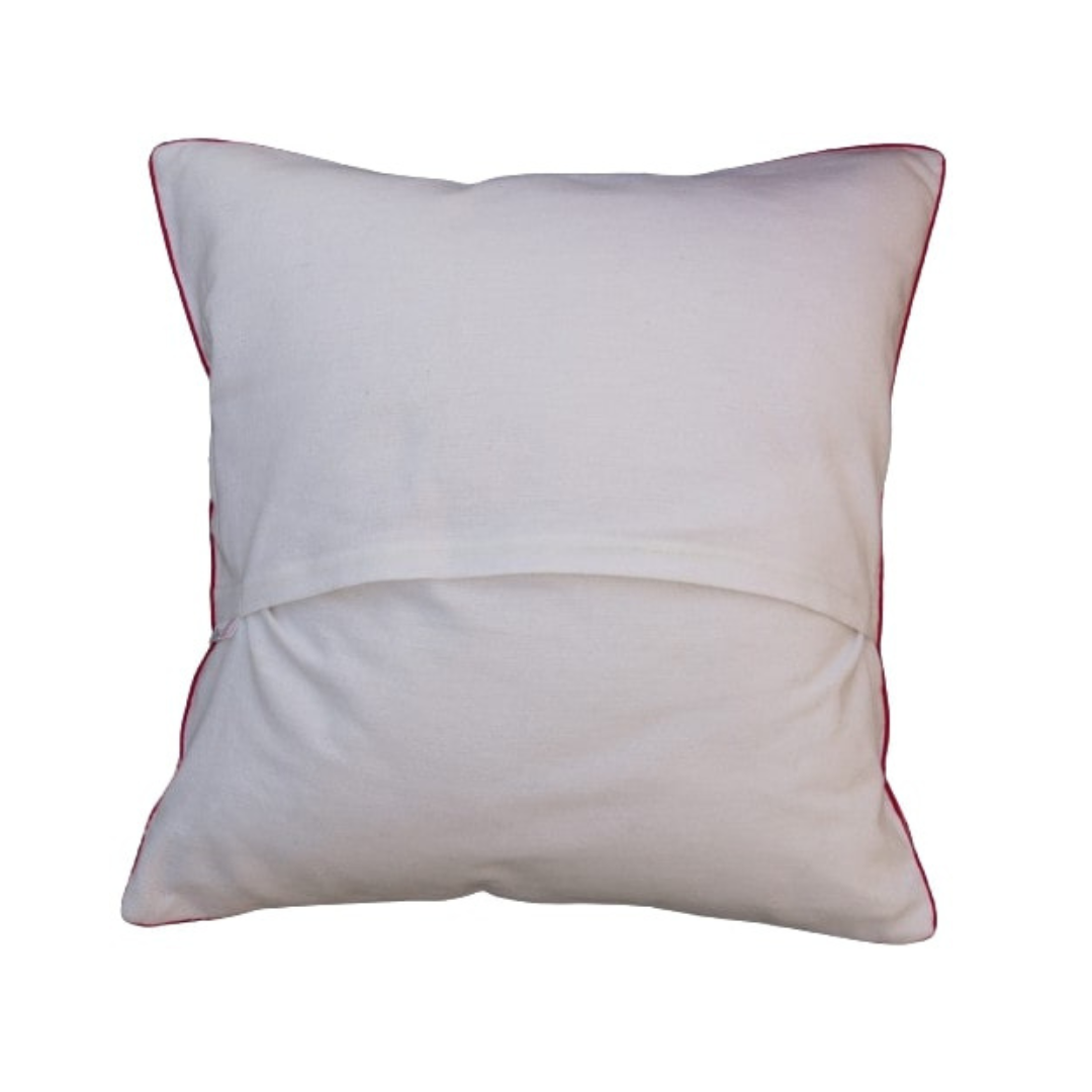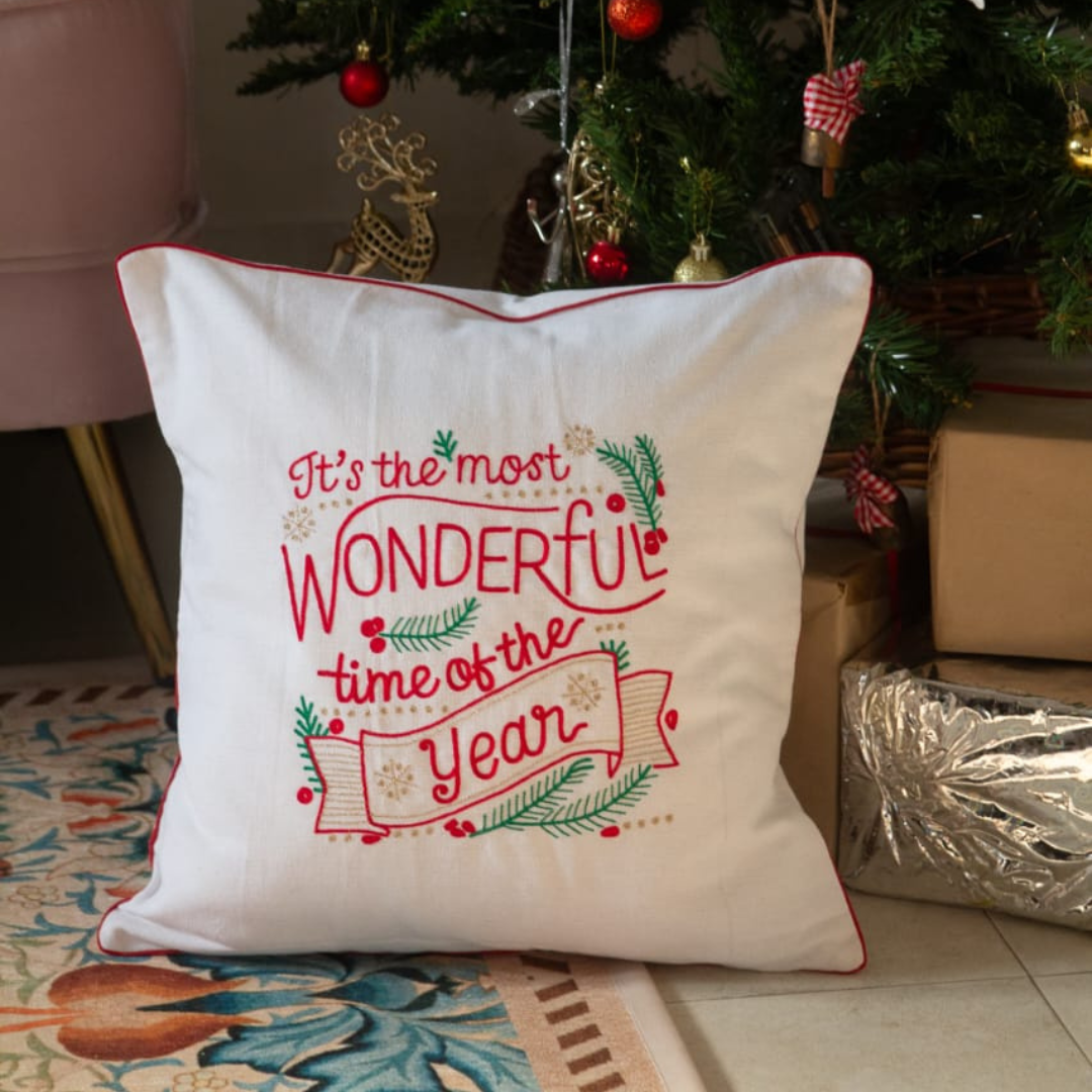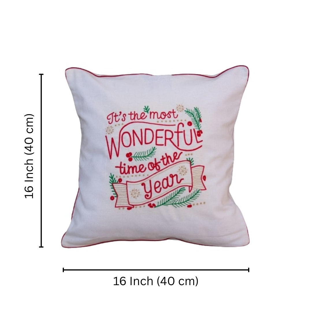 Designed as a festive centerpiece, this cushion cover features a crisp white/off-white background beautifully accented by intricate, multicoloured embroidery. The design showcases the phrase "It's the most WONDERFUL time of the year," surrounded by classic Christmas elements like snowflakes, holly berries, and pine sprigs. Framed by a neat red piped trim, this cushion instantly adds elegant holiday cheer, cozy comfort, and a heartwarming festive spirit to any space.