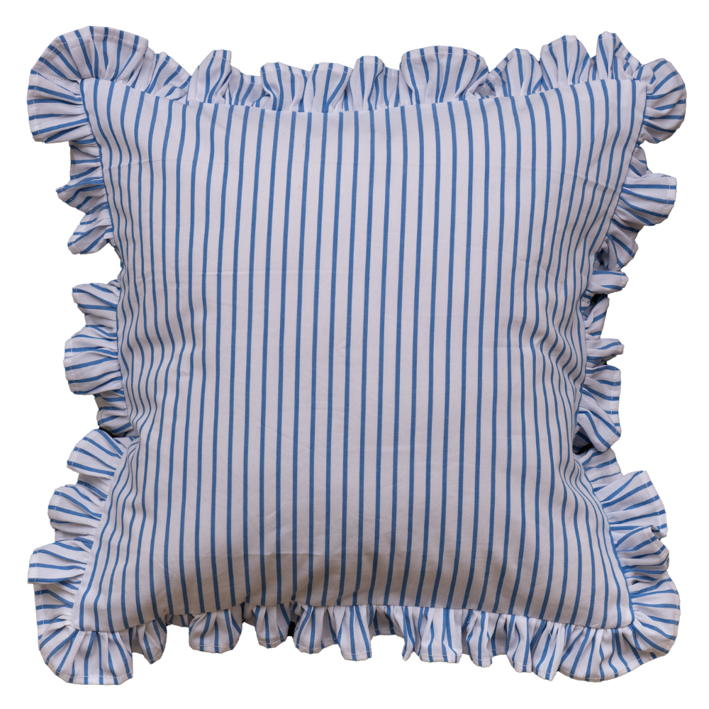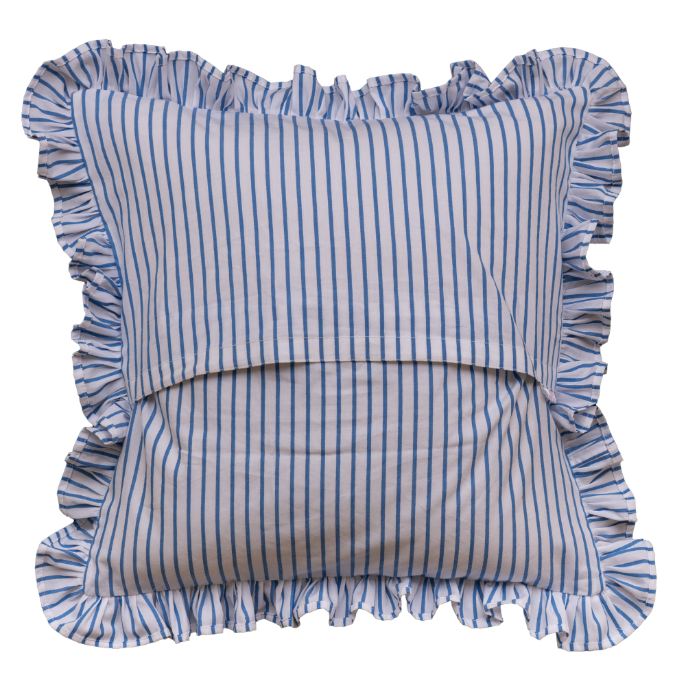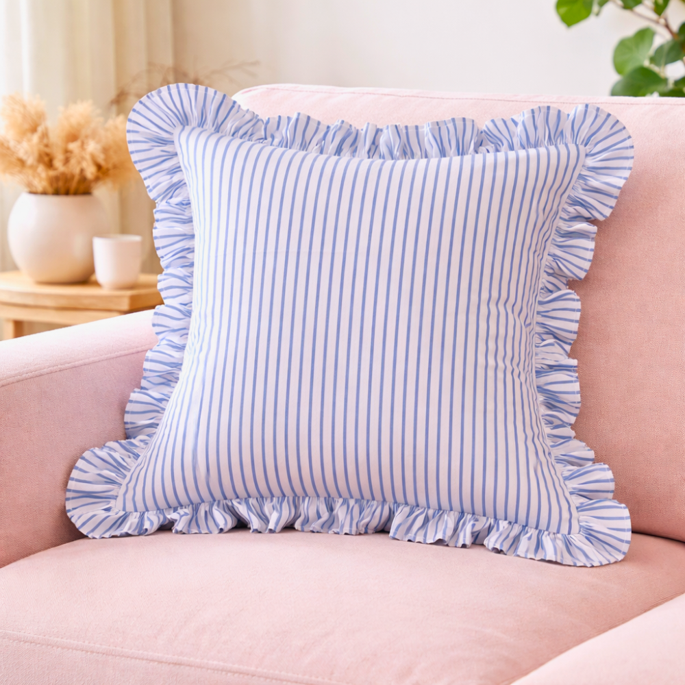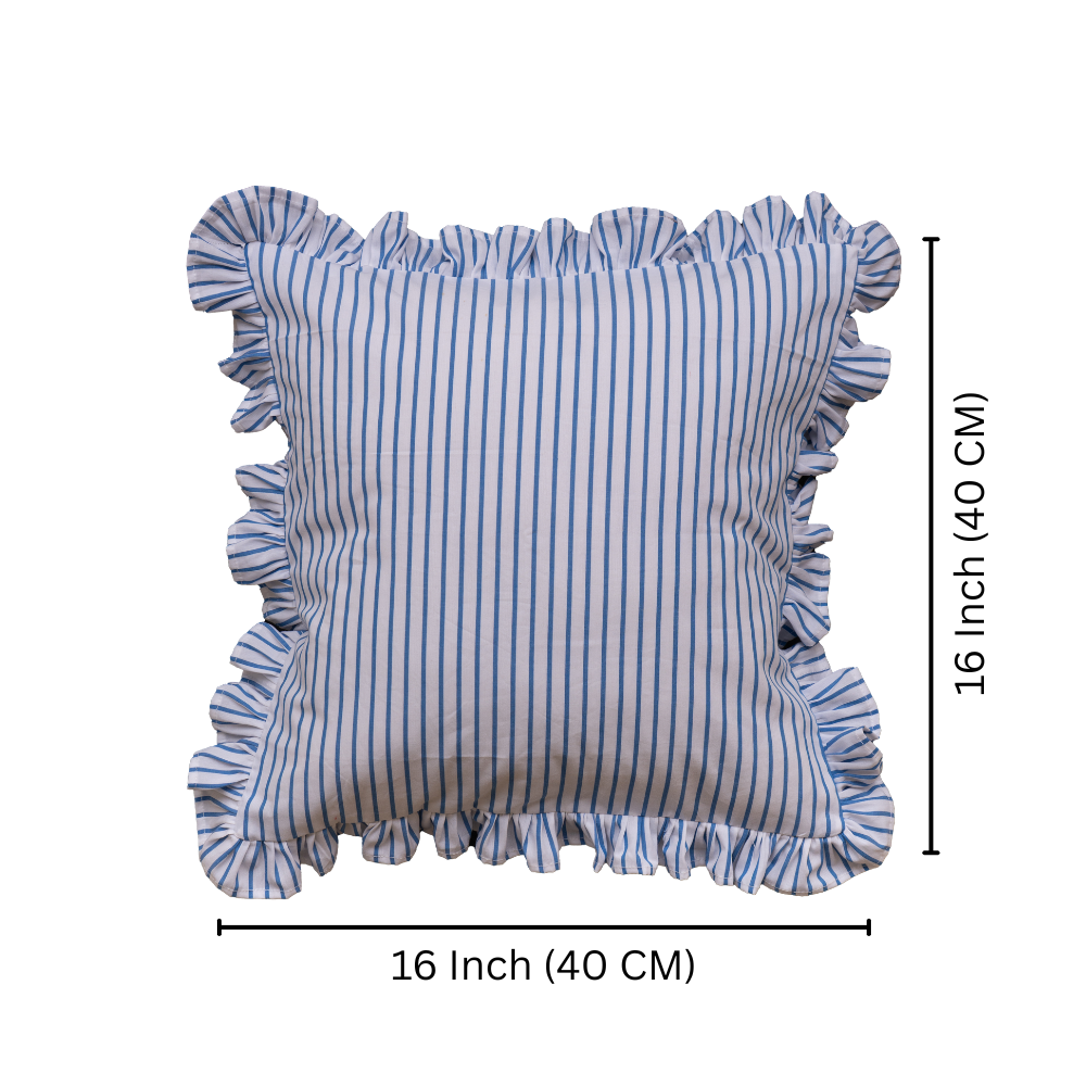 Premium White Blue Striped Ruffle Cushion Cover – Soft Cotton Decorative Pillow Case with Frill Border (16 x 16 Inch)