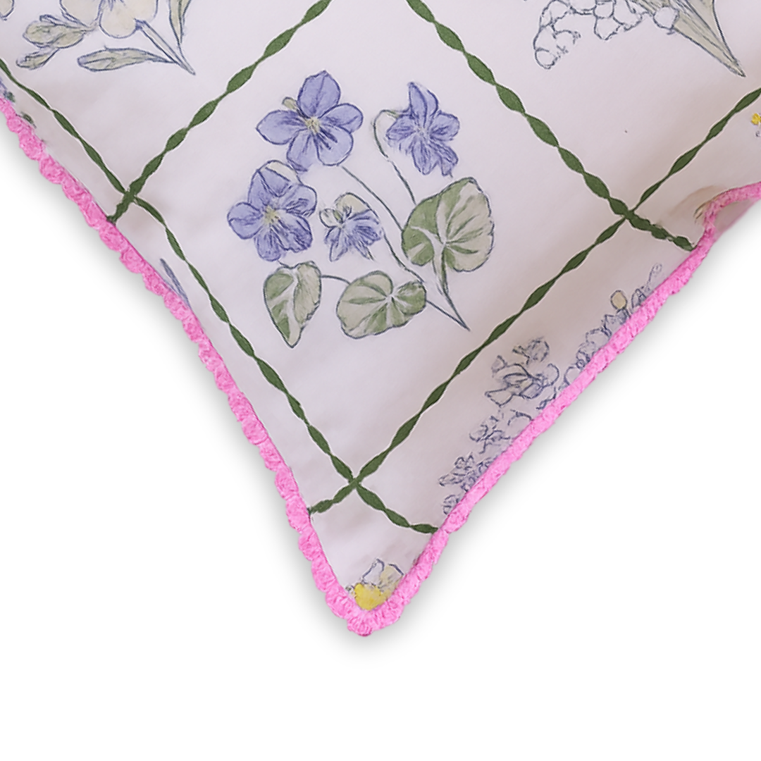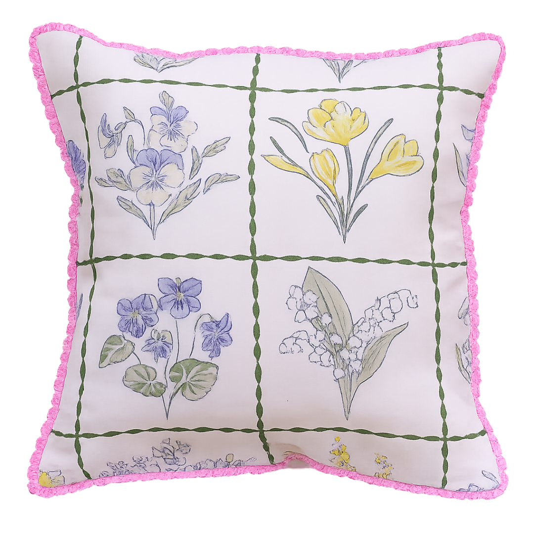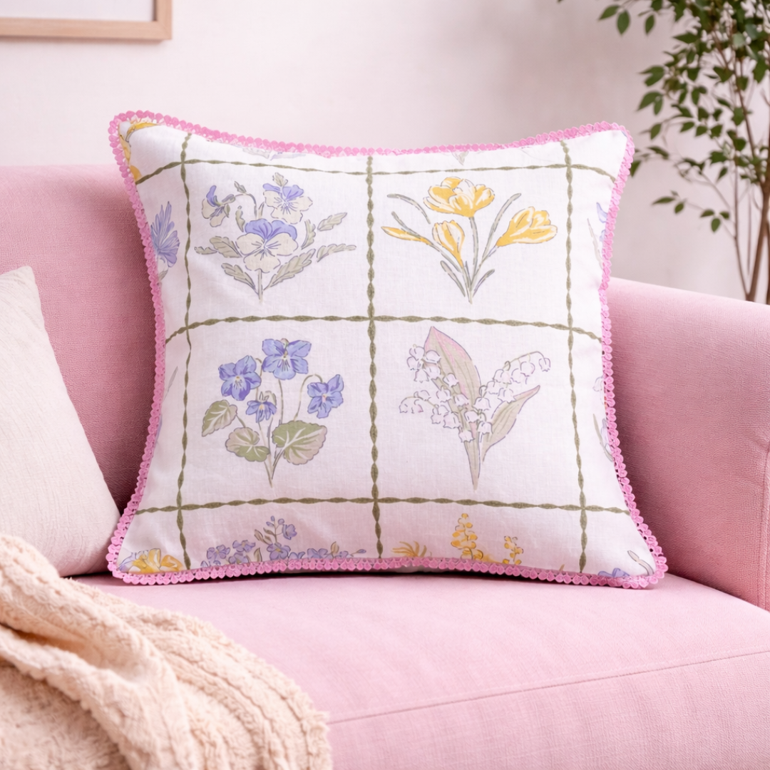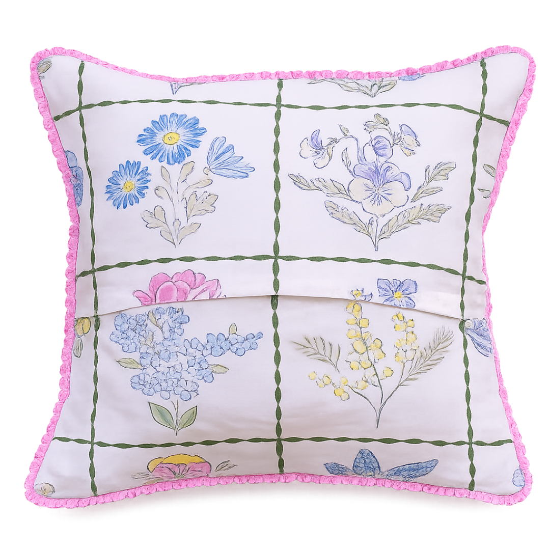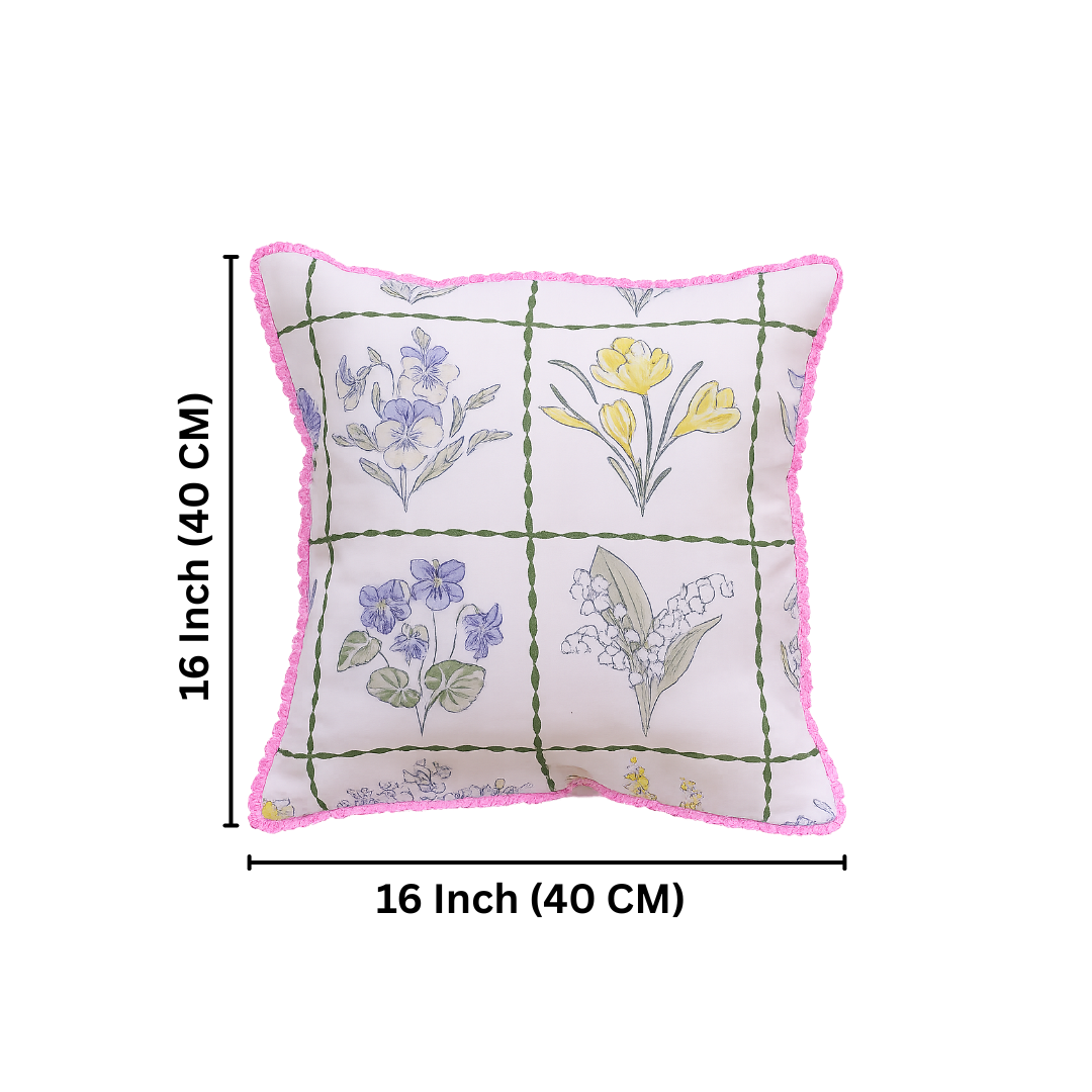 Bring soft garden charm to your home with this beautifully illustrated floral cushion cover. Designed with delicate hand-sketched blooms arranged in a classic grid pattern, it blends pastel blues, yellows, and greens on a soothing base for a fresh, airy feel. The design is elevated with a playful pink ruffled trim, adding a subtle pop of color and a boutique-inspired finish—perfect for creating a cozy yet stylish corner in any modern or vintage-inspired space.