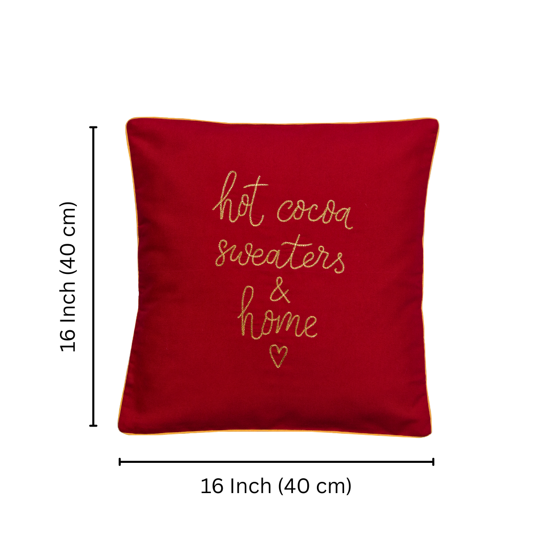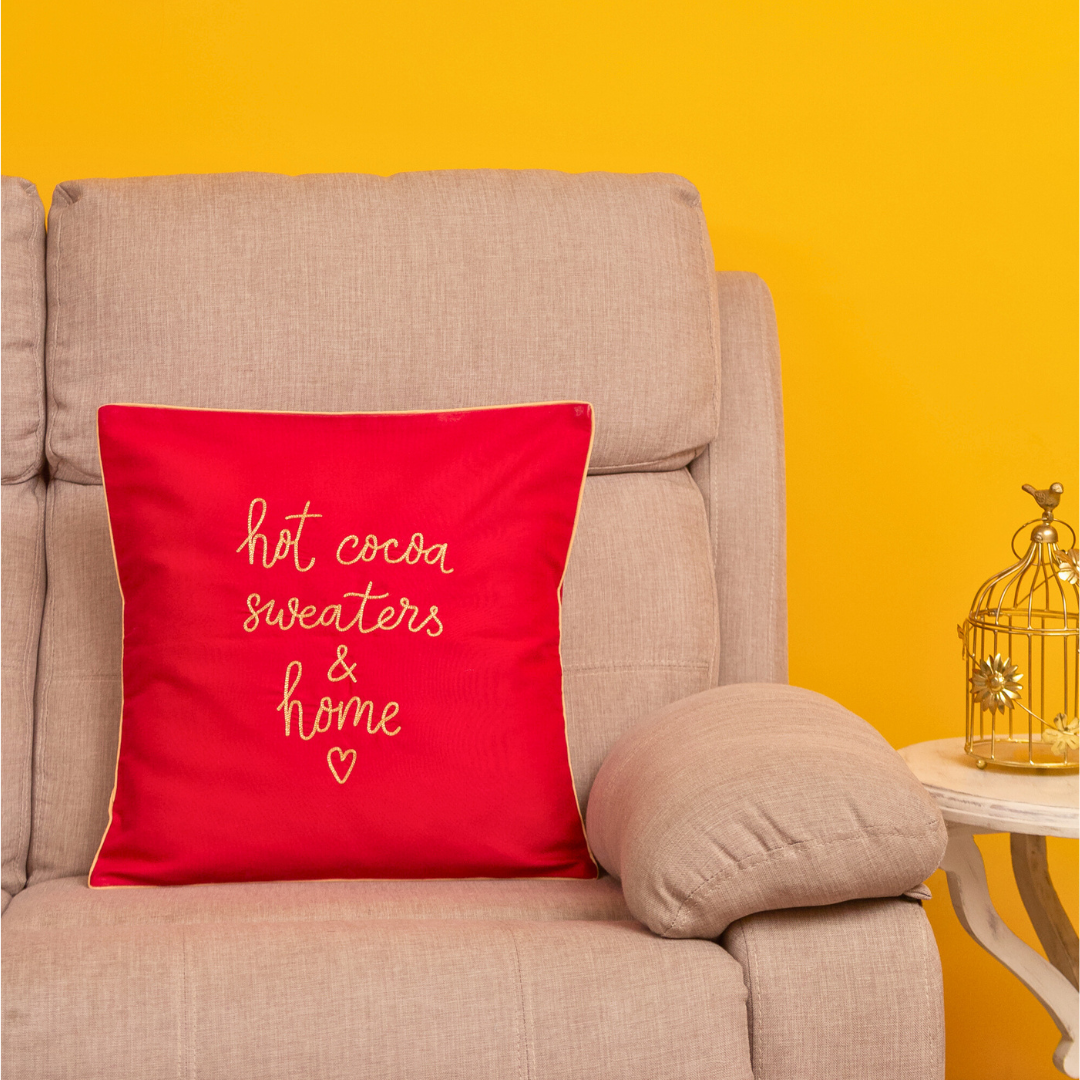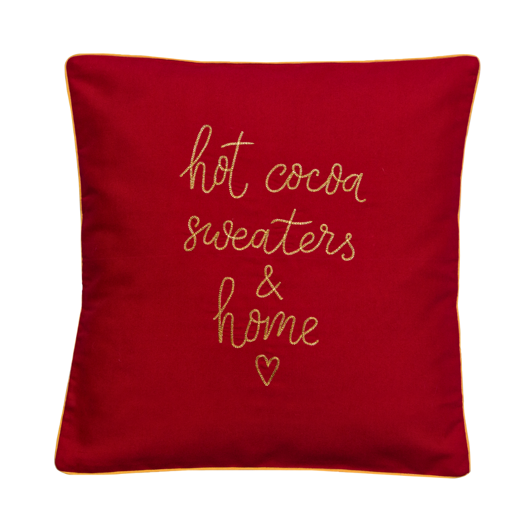 Designed as a perfect invitation to relax, this cushion cover features a bold, classic solid red background. This striking canvas is beautifully accented by elegant embroidered script lettering in gold/lime green that lists the season's ultimate comforts: "hot cocoa, sweaters & home," finished with a sweet heart motif. Framed by a contrasting piped trim, this cushion instantly adds bright, festive color, cozy comfort, and a heartwarming message to any space.