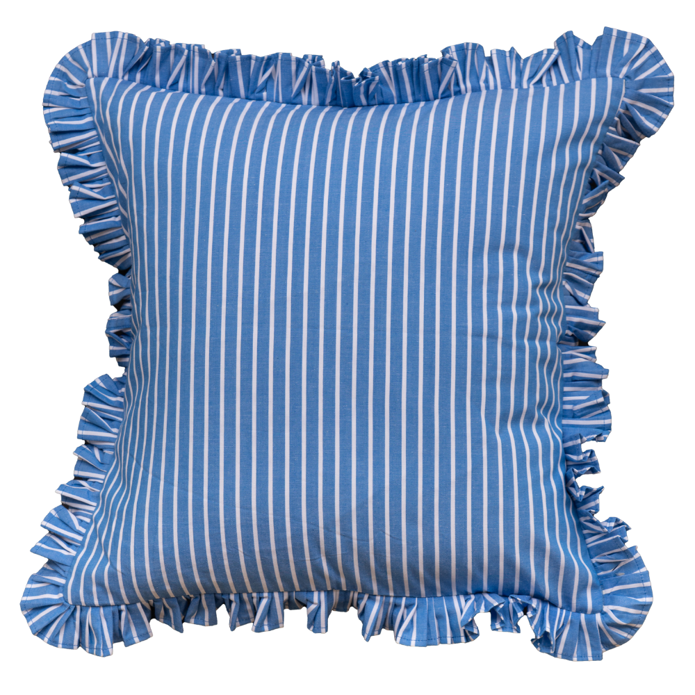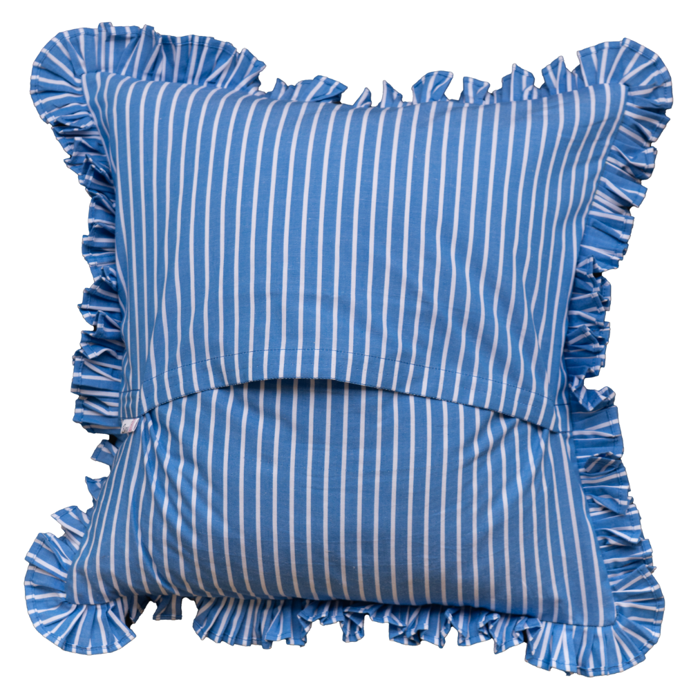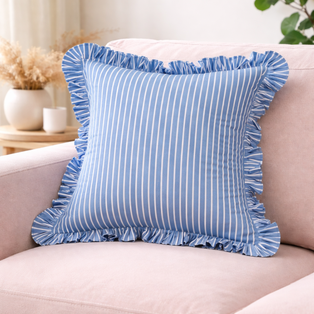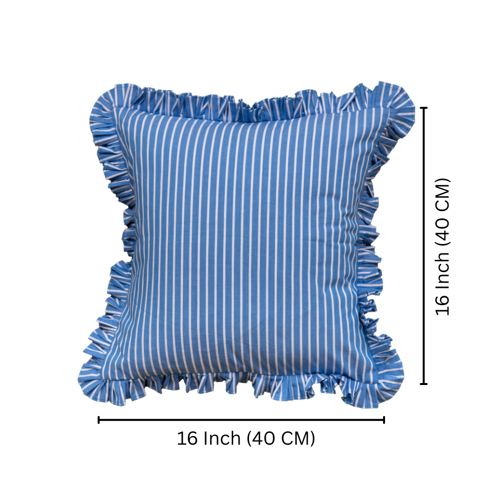 Premium Blue Striped Ruffle Cushion Cover – Soft Cotton Decorative Pillow Case with Frill Border (16 x 16 Inch)