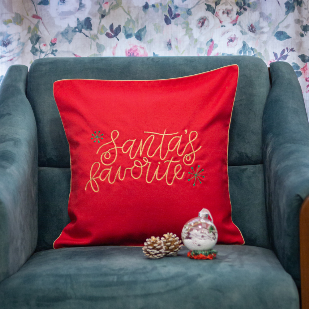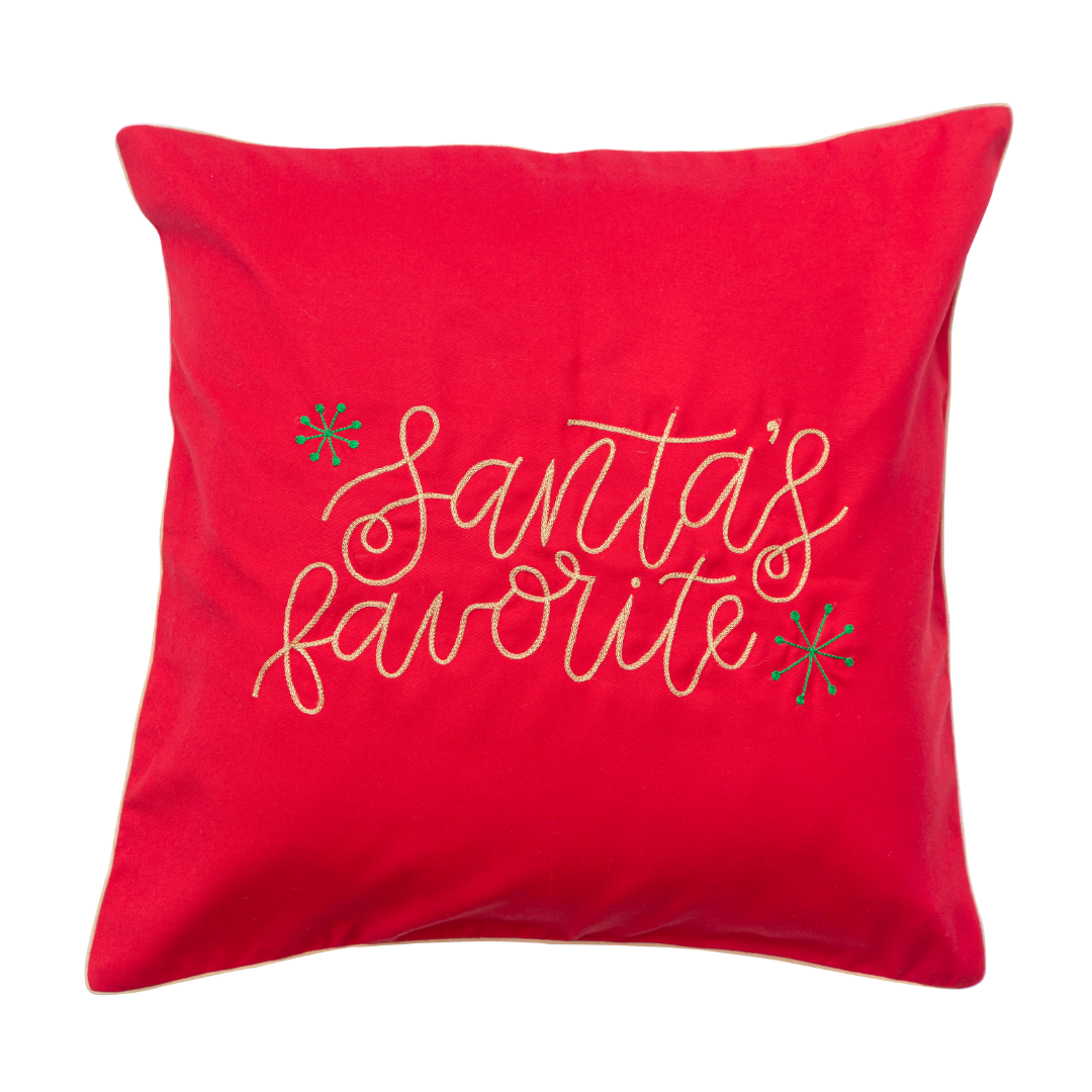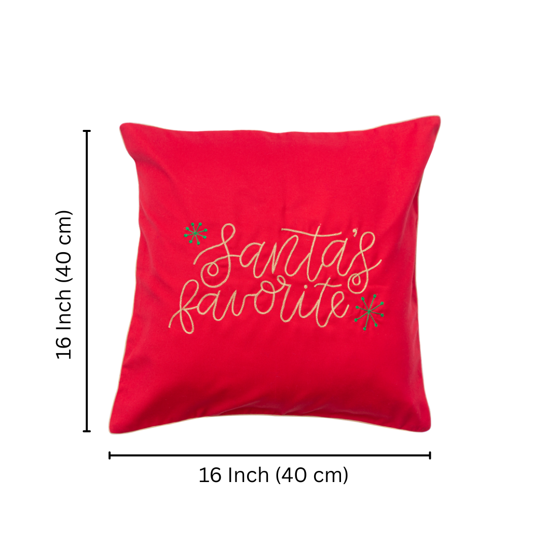 Designed as a vibrant holiday statement, this cushion cover features a bold, cheerful solid red background. This striking canvas is beautifully accented by elegant embroidered script lettering in gold/lime green that playfully declares "Santa's favorite," framed by delicate green snowflake motifs. Finished with a contrasting piped trim, this cushion instantly adds bright, festive color, cozy comfort, and a spirited sense of holiday fun to any space.
