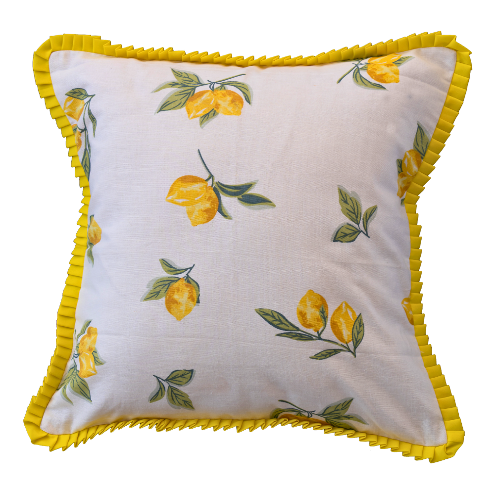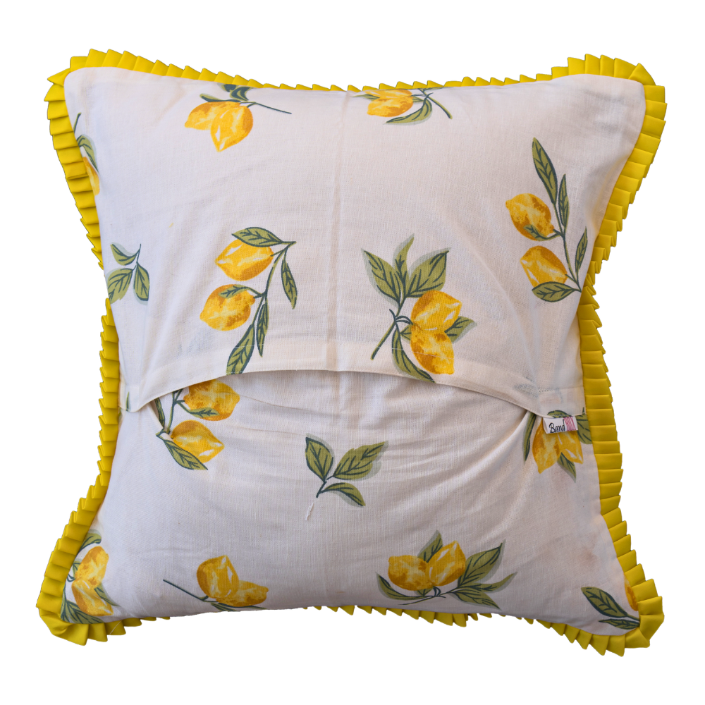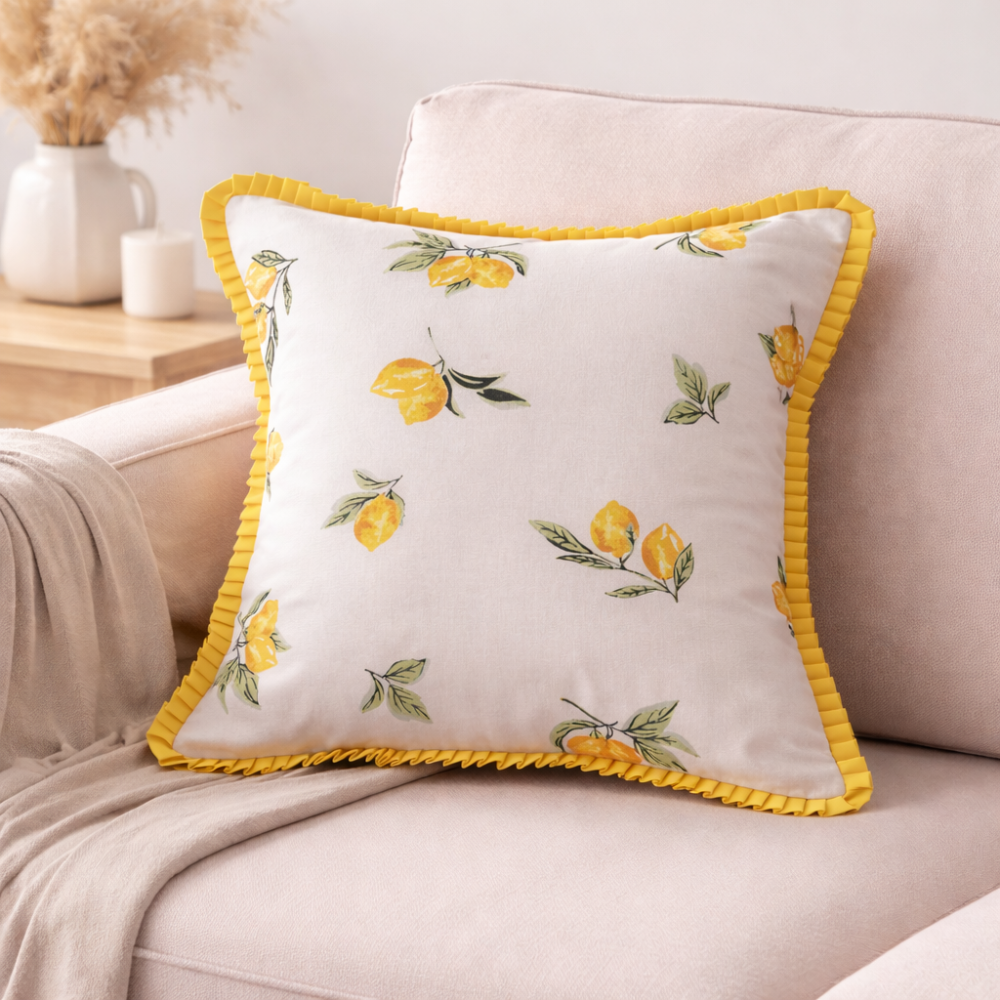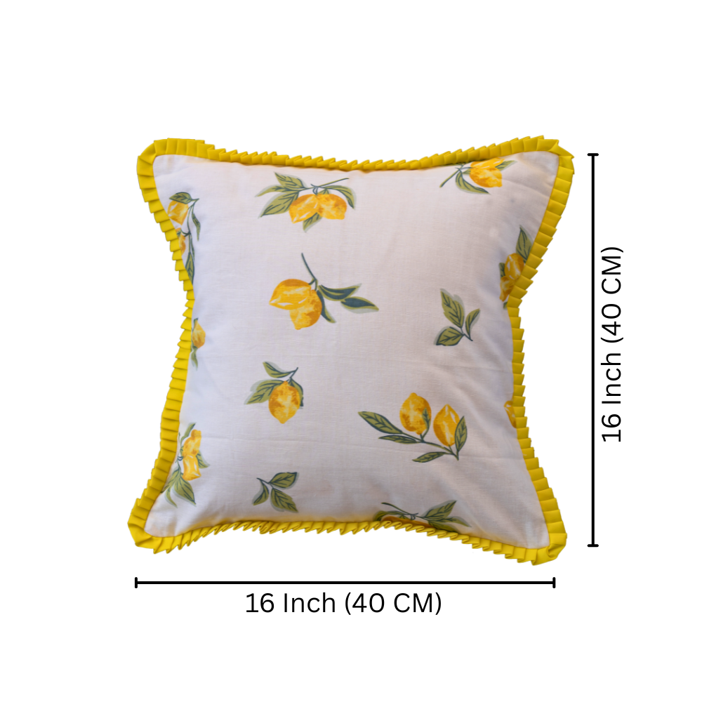 Add a fresh summer charm to your home with this beautifully designed cushion cover. Crafted from soft cotton fabric, it features a vibrant lemon printed pattern that brings a bright and cheerful vibe to any space. The elegant yellow ruffle border enhances its look, making it perfect for modern and cozy interiors. Designed with a convenient slip-on closure, it is easy to use and maintain. Lightweight and breathable, this cushion cover is ideal for a refreshing seasonal update to your living room or bedroom décor.