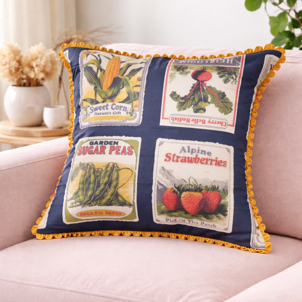 Add a touch of rustic charm and vibrant nostalgia to your living space with our Premium Printed Cotton Cushion Cover. Featuring a delightful collage of vintage-inspired botanical seed packets, this 16x16 inch pillow case is the perfect blend of farmhouse aesthetics and modern comfort.